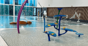 Loudoun County’s newest rec center has plenty of family-friendly features, including a leisure pool with a zero-depth entry splash play area designed for younger swimmers. The space also includes water basketball, a floating play feature, a lazy river, and ample room for free swimming.